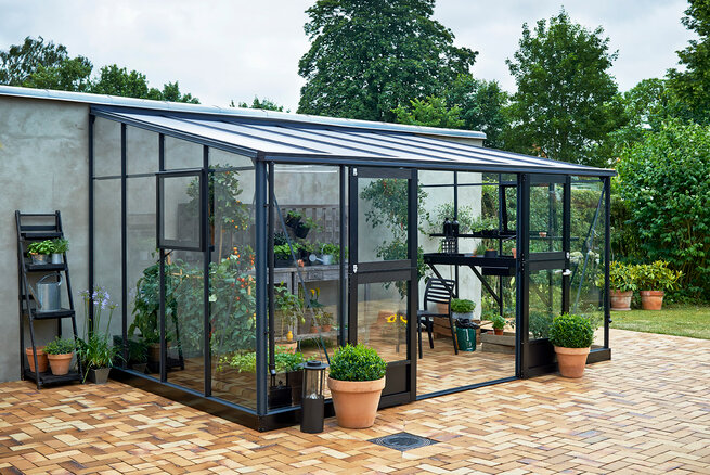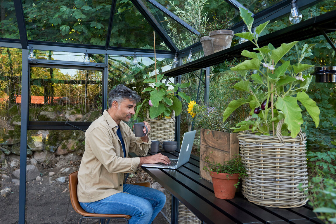 Seitenhöhe von 195 cm, doppelte Stalltüren an der Längsseite und eine konsequent schwarze Gestaltung von Profilen, Türen, Fenstern und Montageleisten. Mit 10,9 m² oder 15,1 m² Fläche und einem großzügigen Raumgefühl richtet sich Jubii 60 an alle, die ihr Gewächshaus als stilvolle Orangerie und Treffpunkt im Garten verstehen, oder aber von Pflanzen träumen, die ungehindert in die Höhe wachsen sollen.