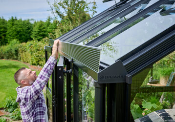 Die Juliana Grand Oase ist die großzügige Antwort auf große Gewächshauspläne. Sie bietet viel Raum für Familienprojekte, den Anbau von Kräutern, Obst und Gemüse und gleichzeitig für gesellige Momente im Alltag. Charakteristisch sind die doppelten Stalltüren an der Längsseite, die fast zwei Meter Seitenhöhe und die pyramidenförmige Dachstruktur, die dem Haus Weite und Offenheit verleihen. Besonders bei diesem Modell ist auch der innovative Belüftungsaufsatz im Dach, der sich bei Wärme dank Zylindern mit Wachs, automatisch öffnet.