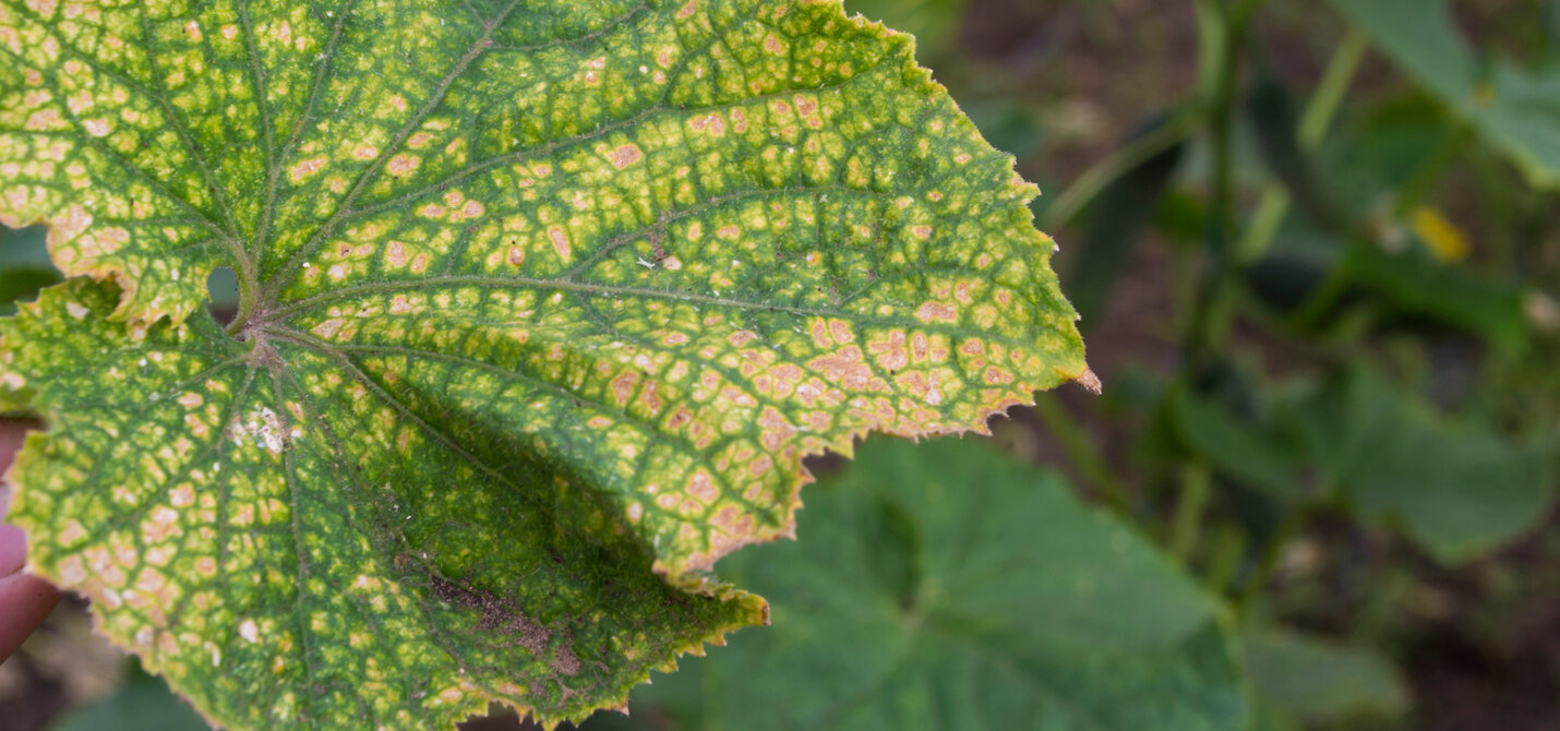 Einer der häufigsten Schädlinge bei Gurken sind Spinnmilben. Sie können verschiedene Pflanzen befallen, doch Gurken mögen sie am liebsten. Die kleinen Spinnmilben saugen den Saft aus den Blattzellen und vermehren sich schnell. Befallene Pflanzen haben gelbbraune Verfärbungen an Blättern und Trieben, und mit der Zeit werden die Blätter ganz hell. Spinnmilben sitzen immer an der Unterseite der Blätter. Die Spinnmilbe heißt so, weil sie ein feines Netz spannt. Das Netz sorgt dafür, dass die Spinnmilbe sich von Blatt zu Blatt und zu anderen Pflanzen bewegen kann.