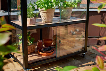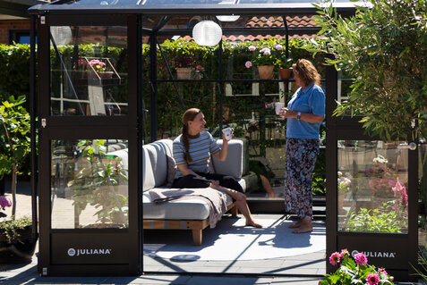 Gleichzeitig wird das Gewächshaus im Sommer mehr und mehr zu einem Raum, den man nicht nur zum Anbauen nutzt. Es ist ein Ort zum Pflegen, Beobachten und Innehalten – morgens mit einer Tasse Kaffee, abends mit offenen Türen und dem Duft von Kräutern und warmem Glas. Genau diese Verbindung aus Funktion und Atmosphäre macht Juliana Gewächshäuser so besonders.